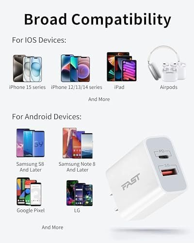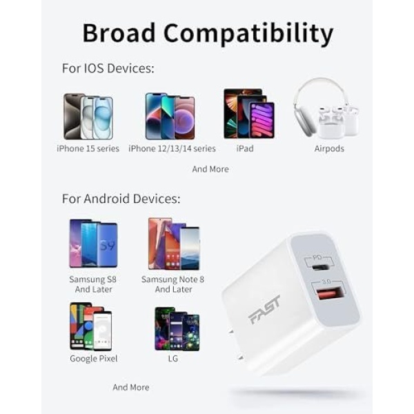 Dual Port High-Speed Charging: USB C Wall Charger has a 20W USB-C Power Delivery port and an 18W USB-A fast charging port. Support for fast charging of most cell phone or tablet devices to minimize waiting time.