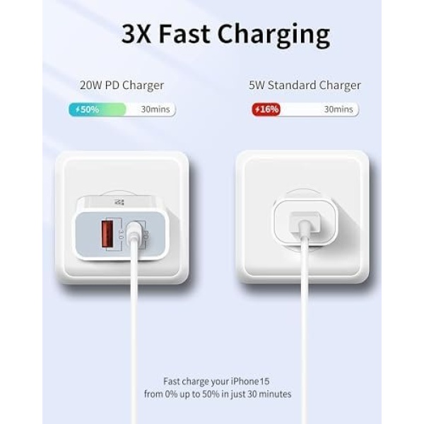 With power delivery 3.0 fast charging technology, charge your iphone 15/14 up to 50% in just 30 minutes. 3X faster than 5W charger.