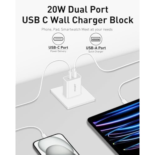 Safe & Reliable: 20W USB C power adapter equipped with multiple safety protection system, automatic identification of equipment and adjustment of power output. Prevent short circuits, overheating, overcharging, and overcurrent to protect your connected devices.
